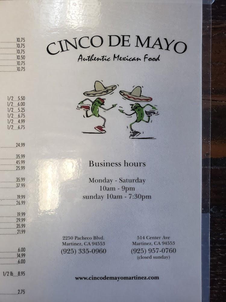 Welcome to Cinco De Mayo, your go-to Mexican restaurant located at 514 Center Ave, Martinez, CA. With a vibrant and relaxed atmosphere, we offer an array of traditional dishes, including delicious nachos and local specialties, perfect for lunch or dinner. Enjoy our spacious terrace, quick service, and convenient takeout or delivery options. We’re family-friendly, with high chairs and a dedicated kids' menu, ensuring enjoyment for all ages. Plus, our venue is wheelchair accessible with ample parking. Join us for a memorable dining experience, and don’t forget to ask about our drink selection! Reservations are welcome.